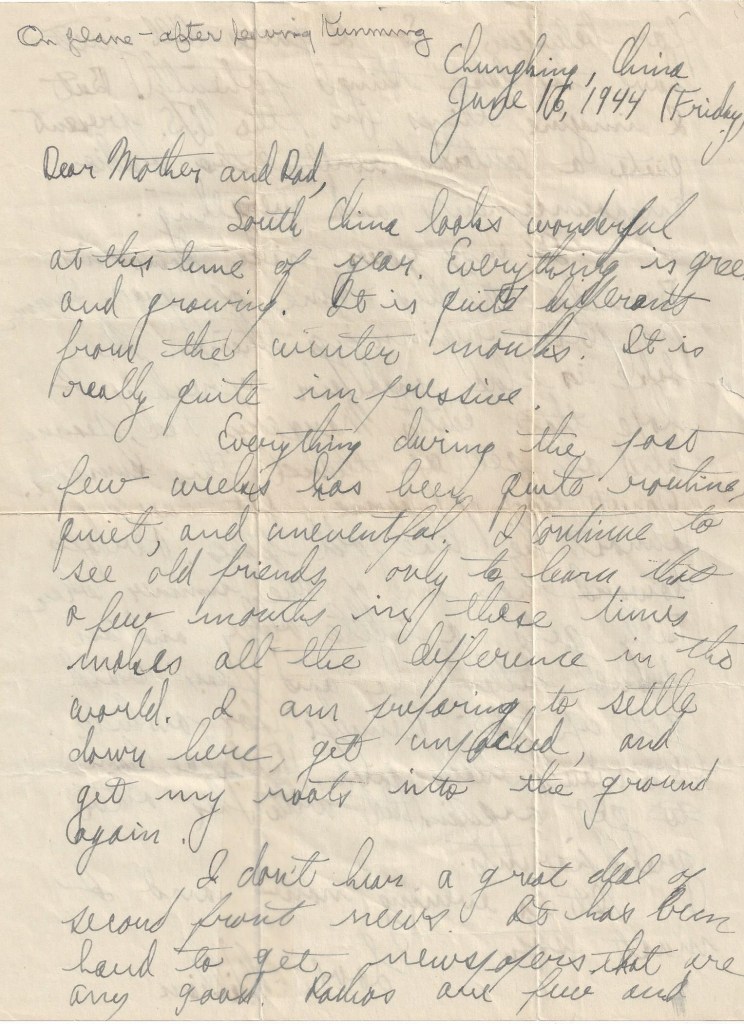 Sometime during April or May, Bill had been reassigned from New Delhi to the U.S. Embassy in Chungking (now Chongqing), China (a JICA branch during WWII), as an assistant naval attaché—probably a cover for his naval intelligence duties. By June 1944, when Bill was to transfer to Chungking, the route via the Low Hump—a much safer route across the Himalayas—had been opened. Until then, the Japanese had held the airfield at Myitkyina in northern Burma, from which they could launch fighter planes to shoot down transports across the lower Himalayas from India to Chungking. But in May 1944, the Allies had recaptured the airfield, and the Lower Hump route from Calcutta via Kunming, China to Chungking became passable. This is the route we now know that Bill took. It was a trip of about 1,300 miles, with a refueling stop at Kunming, about 400 miles from Chungking.
