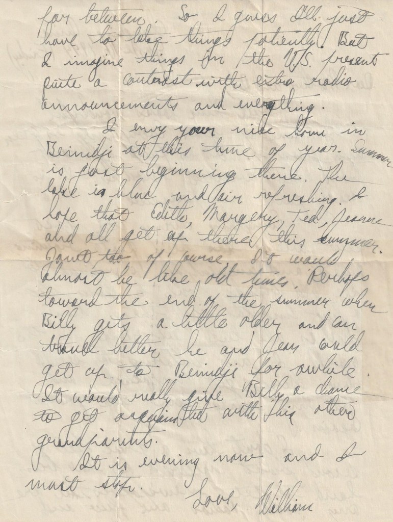 I envy your nice home in Bemidgi at this time of year. Summer is just beginning there. The lake is blue and air refreshing. I love taht Edith, Margery, Ted, Jeanne and all get up ther this summer. Janet too of course. It would almost be like old times. Perhaps toward the end of the summer when Billy gets a little older and can tavel better he and jean could get up to Bemidji for awhile. It would really give Billy a chance to get to know his other grandparents.
